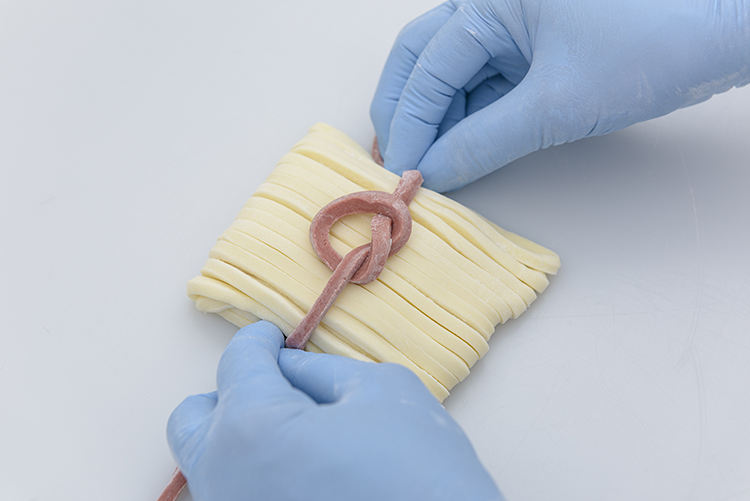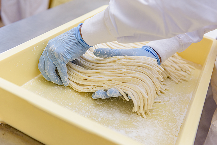 包装も麺が切れたり、傷まないようにするために、一つひとつ手作業でカバー。ゆで時間の短縮化や、ゆで上がった麺を洗う際に余分な水を使わないようにするために、打ち粉にも配慮しています。