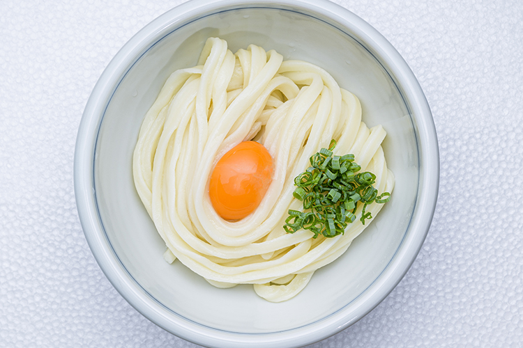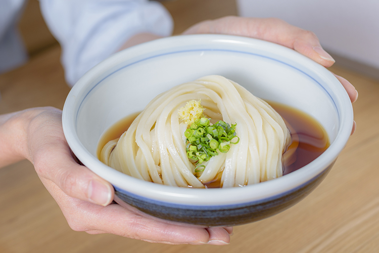 さぬきうどんの大きな特徴でもある手打ちや足踏みも、十分な寝かし時間をとりながら完全手作業で何度も対応。仕上げは18度に温度設定された熟成庫で一晩寝かし、約4.1ミリの厚さに生地を伸ばしてから包丁で丁寧に切ります。徹底したレシピによって、細麺ながら抜群の喉ごしと心地よい口当たりを実現しました。