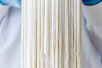 このひと⼿間により、なめらかで、ふっくらとした麺に仕上がります。振るいにかけるときに⼩⻨の⽔分量を確かめ、最適な⽔加減を調整しています。
