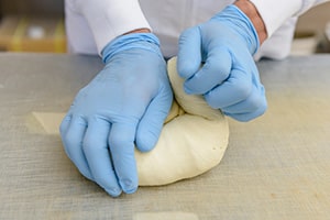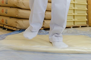 重すぎず軽すぎない適切な⼒加減と28分という正確な⾜踏み時間が、もちもちとした弾⼒を⽣み出しています。⾜踏みしながら⽣地の柔らかさをもチェックします。