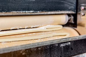 ⾜踏みした⽣地を伸ばします。麺を切ったときに4.1mmの厚さになるように調整しています。